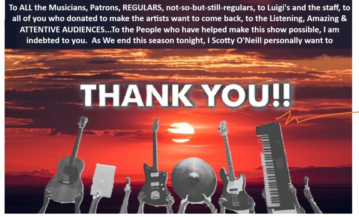 Inspired from Armando's music club (2005-2020), Scotty wanted to create a space that provides an attentive, listening audience after performing at a busy, non-listening restaurant gig. Those are fine for playing 'the gig' but lack the vibes for truly digging in to original material and nuanced delivery. Thus, in April of '23 it started, and Scotty hosts each week to patrons who are our driving force - attending, listening and supporting this program with an appreciation for LIVE music. Below, some images and recaps so far of this incredible series. Thank you to ALL!